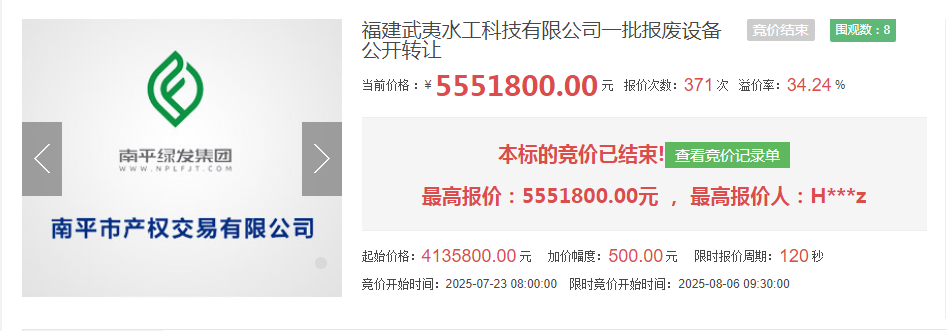 近日,福建武夷水工科技有限公司報廢設備轉讓項目在南平市產權交易有限公司高溢價成交,市場化運作助推資產增值超34%。該項目掛牌價413.58萬元,經過多輪激烈競價,最終以555.18萬元成交,實現增值141.6萬元,溢價率達34.24%,實現閑置資產高效盤活與顯著增值,彰顯產權交易平臺資源配置效能。